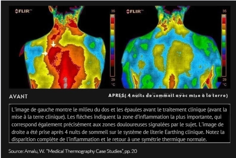 Nous utilisons des images infrarouges pour observer le fonctionnement de notre corps en examinant la circulation sanguine et l'inflammation. Dans la série d'images présentées, prises avant l'utilisation du système de sommeil Earthing, les différentes couleurs représentent différentes températures. Les rouges foncés indiquent les zones de chaleur, signe d'inflammation, où votre corps travaille dur pour guérir. En regardant les images de près, nous pouvons constater une différence radicale avant et après, qui montre clairement à quel point la capacité du corps à se guérir lui-même s'améliore grâce à la mise à la terre.